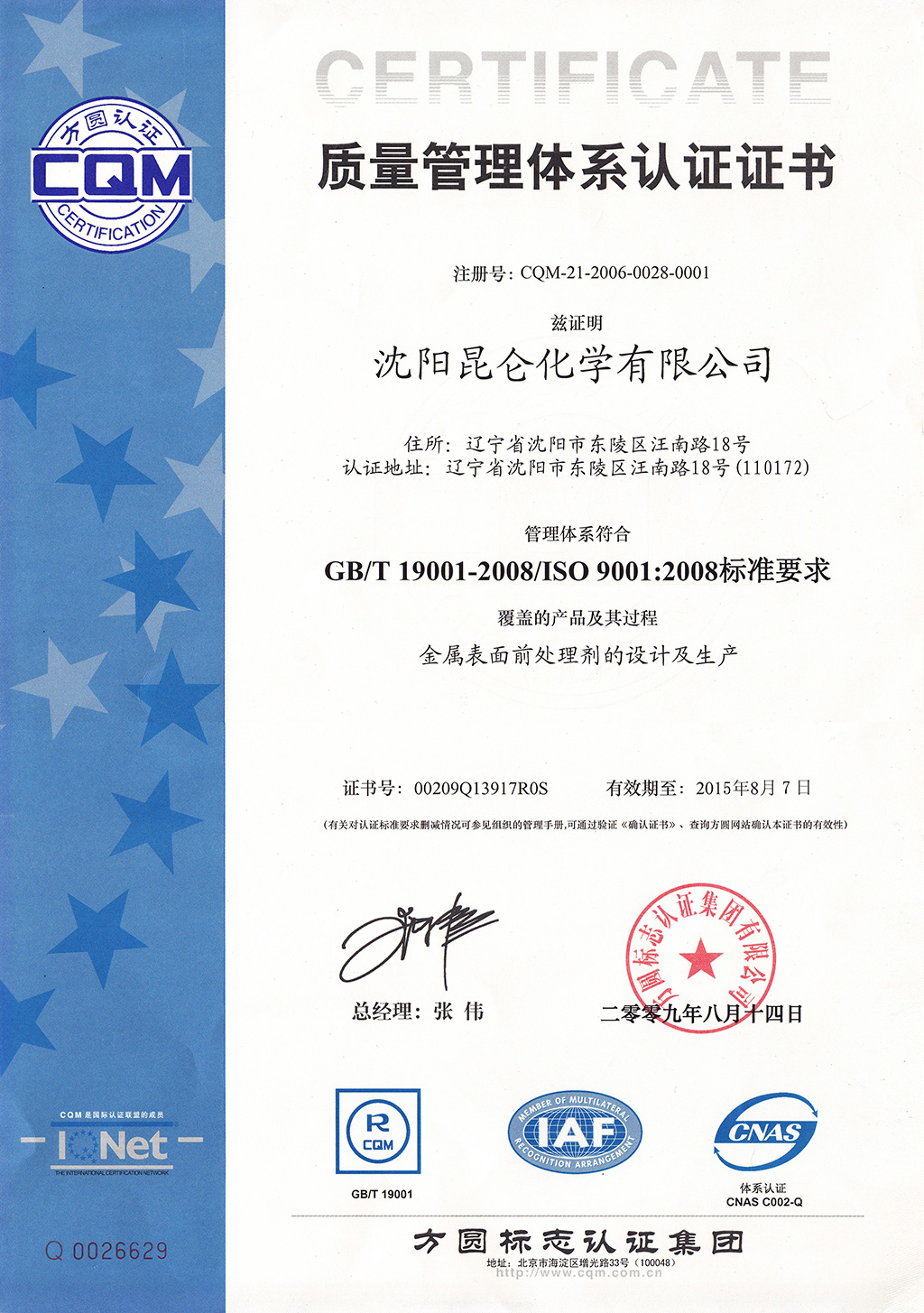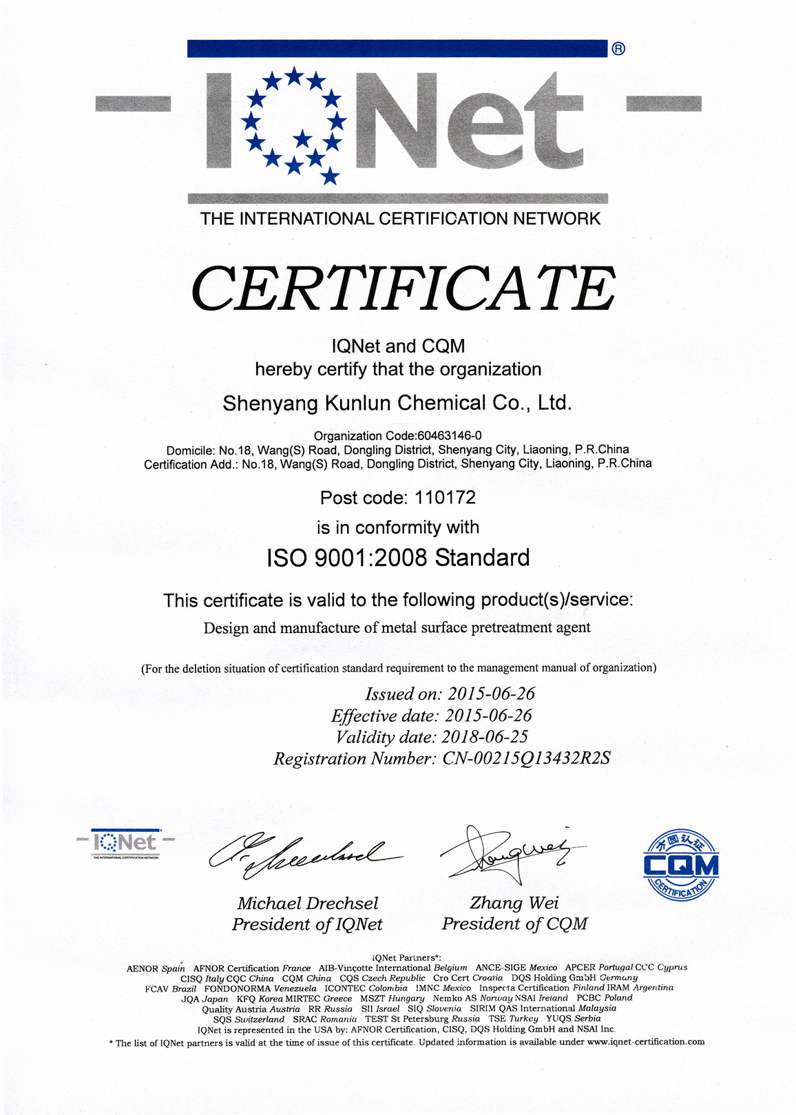 Outstanding supplier沈陽(yáng)昆侖化學(xué)有限公司是沈陽(yáng)昆侖實(shí)業(yè)有限公司與新加坡寶閣集團(tuán)共同投資的合資企業(yè)。其中,中方占51%股份,外方占49%股份公司擁有國(guó)內(nèi)獨(dú)立的知識(shí)產(chǎn)權(quán),專(zhuān)業(yè)生產(chǎn)具有國(guó)內(nèi)領(lǐng)先,國(guó)際當(dāng)代水平的各種磷化劑、硅烷覆膜劑、脫脂劑、潤(rùn)滑劑、表面調(diào)整劑、緩蝕劑、漆霧絮凝劑等七個(gè)類(lèi)別,200余個(gè)品種的相關(guān)化工產(chǎn)品。